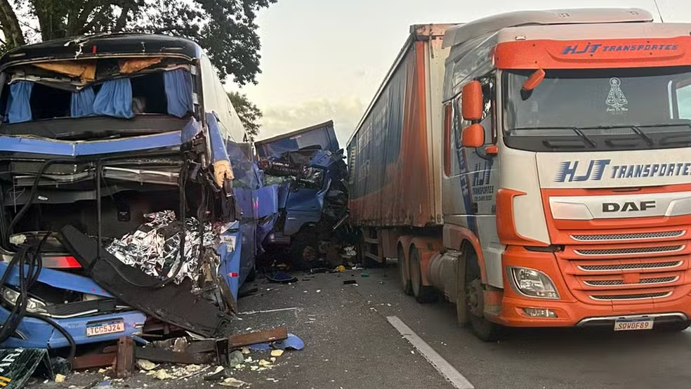O acidente envolveu quatro caminhões, um ônibus da empresa Guanabara e um carro. Com o impacto, houve vazamento de combustível na pista, situação que exigiu o isolamento da área pelas equipes de emergência para evitar riscos adicionais.