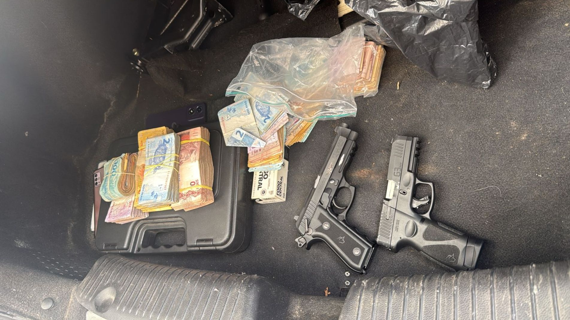 No interior do imóvel, foram encontradas duas pistolas de calibre nove milímetros, sessenta porções de maconha, cento e quarenta e oito porções de cocaína e noventa e seis pedras de crack. Também foram apreendidas diversas munições intactas, todas armazenadas em caixas, além da quantia em dinheiro.