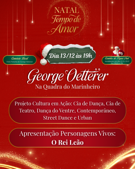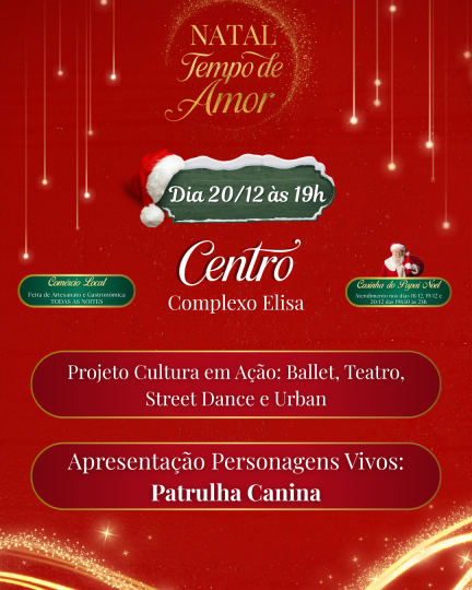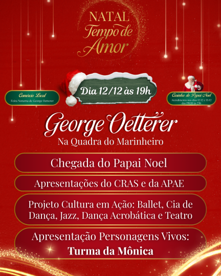 No dia 12, a programação segue na Quadra do Marinheiro, em George Oetterer, onde ocorre a chegada do Papai Noel a partir das 19h. O público também poderá acompanhar apresentações do CRAS, Apae e do Projeto Cultura em Ação, que trará números de ballet, dança acrobática e teatro. A noite terá ainda personagens vivos da Turma da Mônica, garantindo diversão para as crianças.