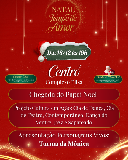 A partir do dia 18, as atividades se concentram no Complexo Elisa, no Centro, com nova chegada do Papai Noel, além de apresentações de dança, teatro, jazz e sapateado. Para o público infantil, haverá personagens vivos da Turma da Mônica.