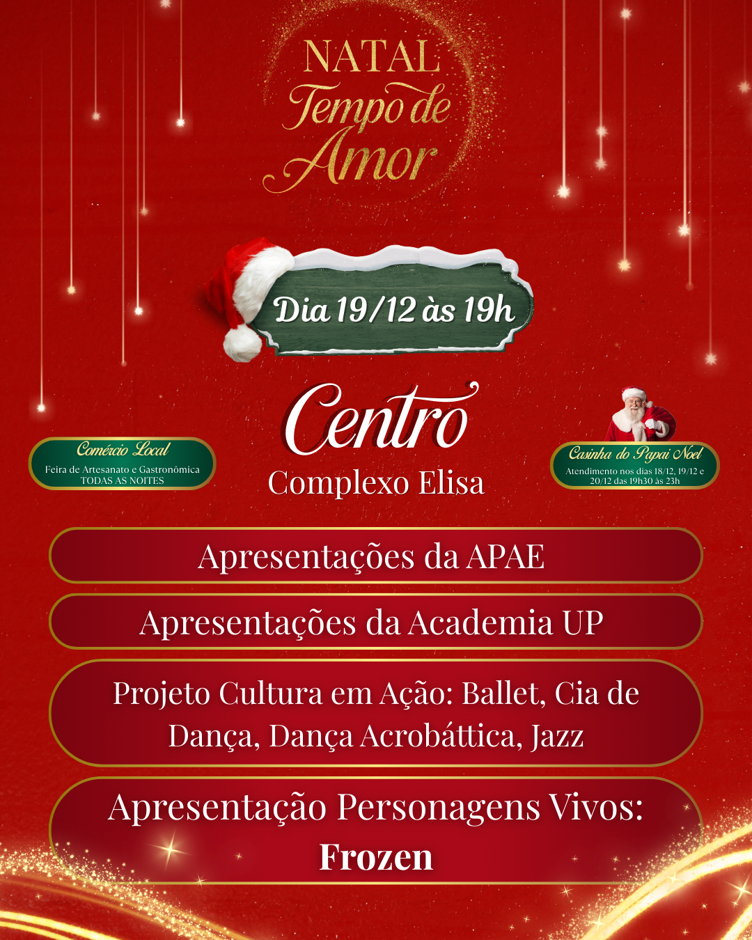 No dia 19, a partir das 19h, estão previstas apresentações da Apae, da Academia UP e do Projeto Cultura em Ação, que inclui ballet, dança acrobática e jazz. A noite terá ainda personagens vivos inspirados na animação Frozen.