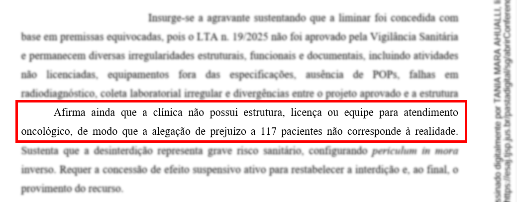 A clínica chegou a obter liminar em mandado de segurança ao alegar ter corrigido todas as falhas estruturais e afirmando que o fechamento prejudicaria 117 pacientes em tratamento oncológico. Porém, ao analisar o agravo apresentado, a desembargadora Tania Ahualli concluiu que não havia provas suficientes de que todas as irregularidades apontadas pela Vigilância Sanitária foram sanadas. A magistrada também observou que, de acordo com as informações oficiais, a CLIMEP não possui licença, estrutura física adequada ou equipe habilitada para atendimento oncológico, o que contraria a alegação de prejuízo a pacientes.
