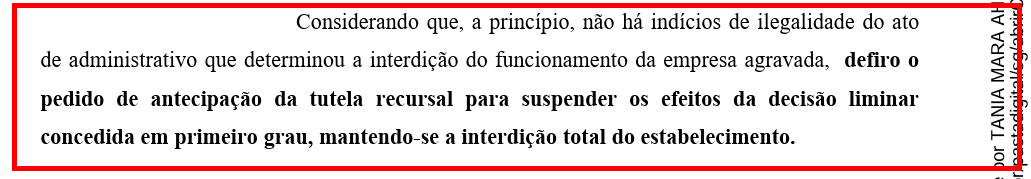 Em sua decisão, a desembargadora reforçou que os atos administrativos da Vigilância Sanitária possuem presunção de legitimidade e veracidade. Assim, cabe à clínica demonstrar de forma clara e documental eventual ilegalidade ou erro no procedimento que levou à interdição, o que não ocorreu no estágio atual do processo. Para a desembargadora, não há indícios de ilegalidade ou abuso no ato que determinou o fechamento do estabelecimento, especialmente considerando que se trata de serviço de saúde, área em que qualquer falha pode gerar risco direto a pacientes e colaboradores.